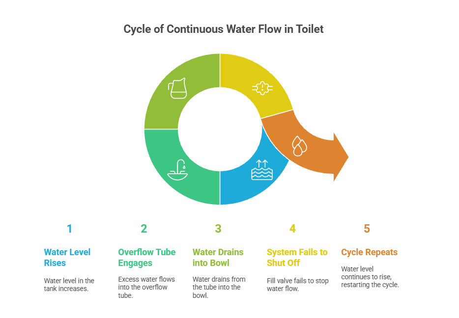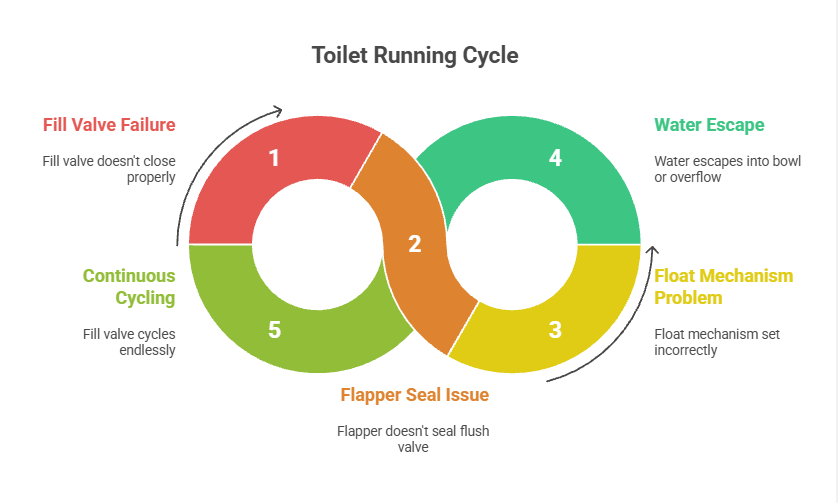 When a toilet keeps running, it means the internal shut-off mechanism has failed to stop water flow at the right point. Water may be leaking slowly into the bowl, spilling into the overflow tube, or cycling on and off as the cistern level drops. While the toilet may still flush normally, continuous or repeated running signals an internal fault that will not resolve on its own and typically worsens over time.