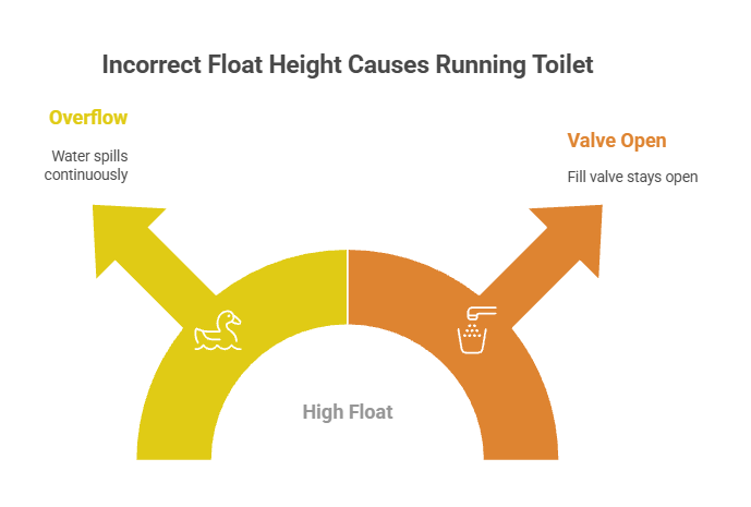 The float controls when the fill valve shuts off. If the float is set too high, sticks, or moves sluggishly, the valve does not close at the right time. Water may rise above the normal level and spill into the overflow tube, causing continuous running. Floats can also bind against the cistern wall or become waterlogged, preventing accurate shut-off.