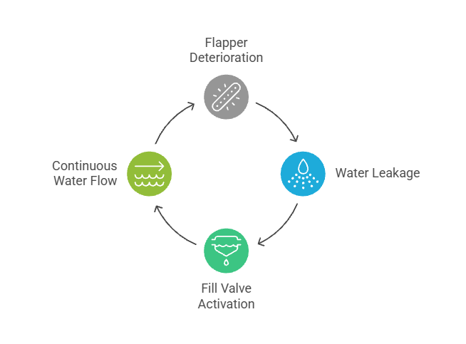 As the tank refills, some of the incoming water is constantly escaping through the faulty flapper. The result is a slow or never-completed refill, along with regular refilling sounds and unnecessary water use.